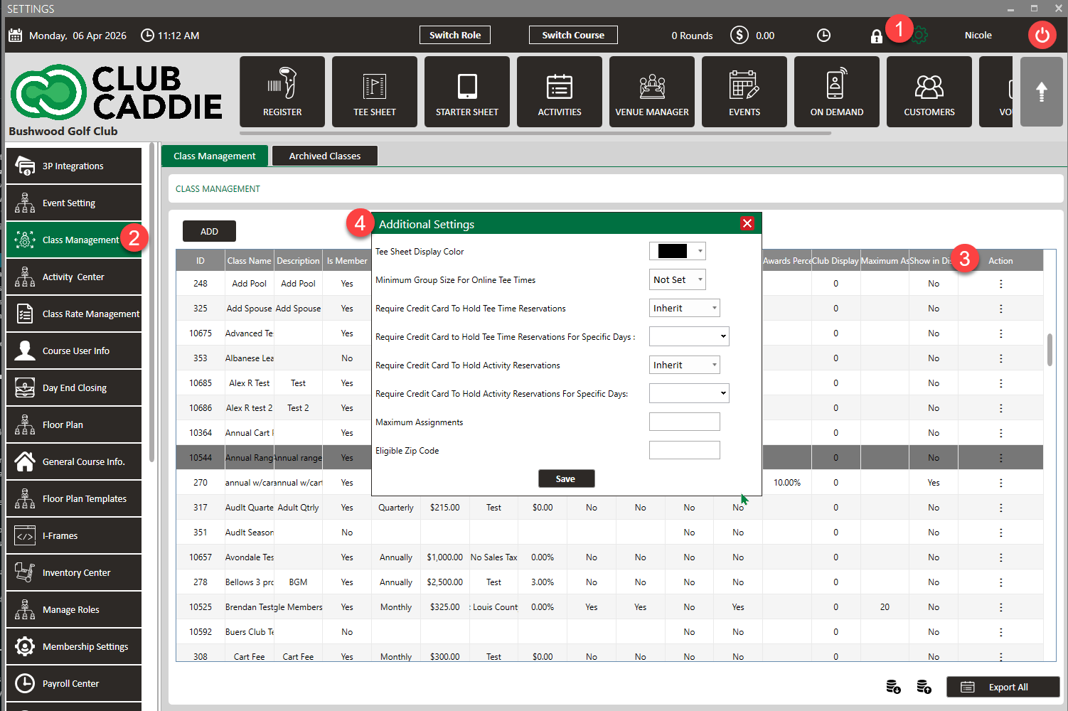 [IMAGE: Class Management Action dropdown showing the Additional Settings option]