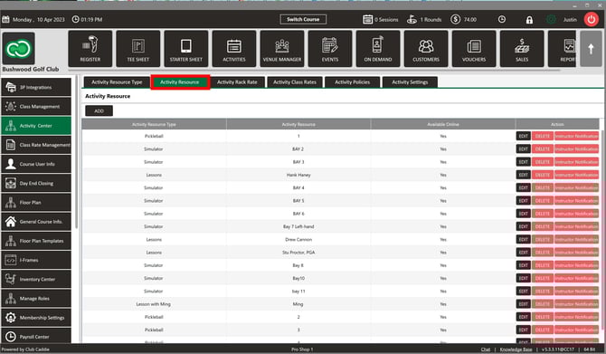 Activity Resource Type: The Activity Center enables club operators to create and manage " Activity Resource Types." These are different types of course resources, such as simulators, lessons, or pickleball. Once created, these resource types can be found within the ACTIVITIES module.