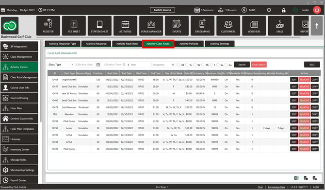 Activity Class Rates: Operators can set class rates for activities, similar to golf class rates. This includes selecting the class type, resource type, duration, day of the week, start and end dates, start and end times, online availability, rate, occupancy level, maximum usage, display sequence, and booking windows.