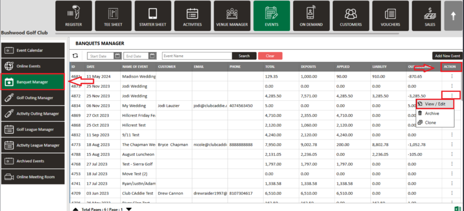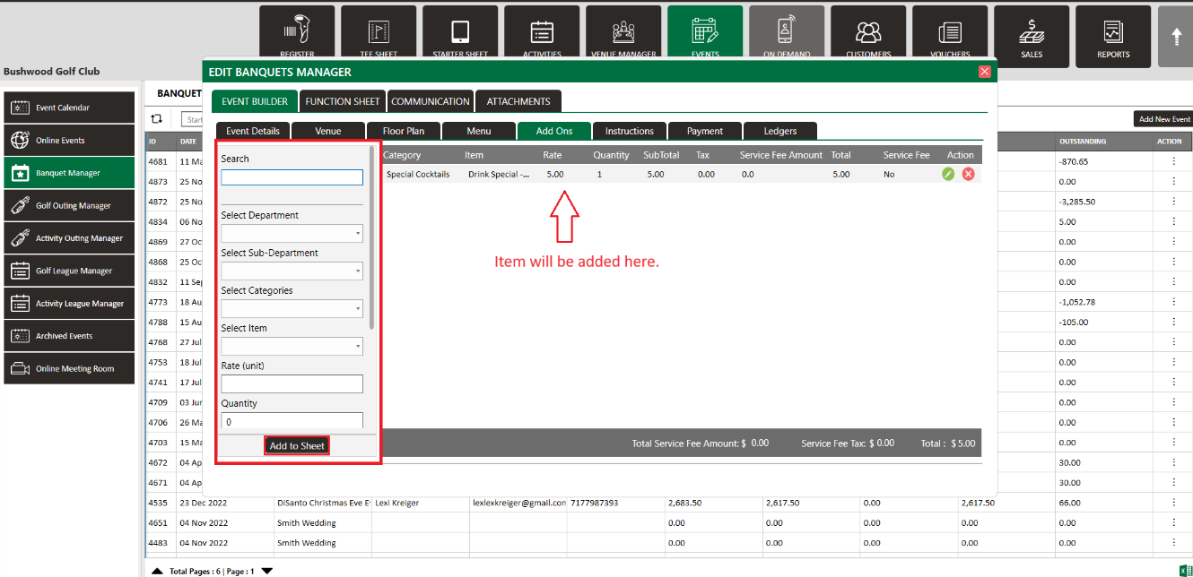 Step 2: Click on Banquet Manager in the left-hand menu. The Banquet Manager shows a list of existing banquet events. Under Action, click on the three small dots, followed by View/Edit. The System will generate an EDIT BANQUETS MANAGER pop-up window. Click Add Ons under the EVENT BUILDER Tab.