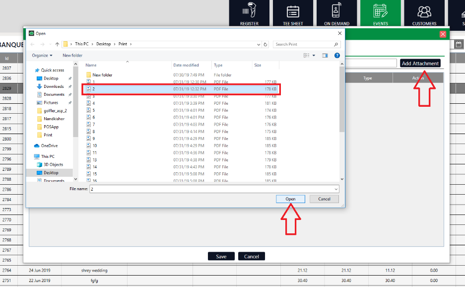 Step 5: Select the desired attachment from the device and hit the Open button. This will attach an attachment to the Banquet Event.