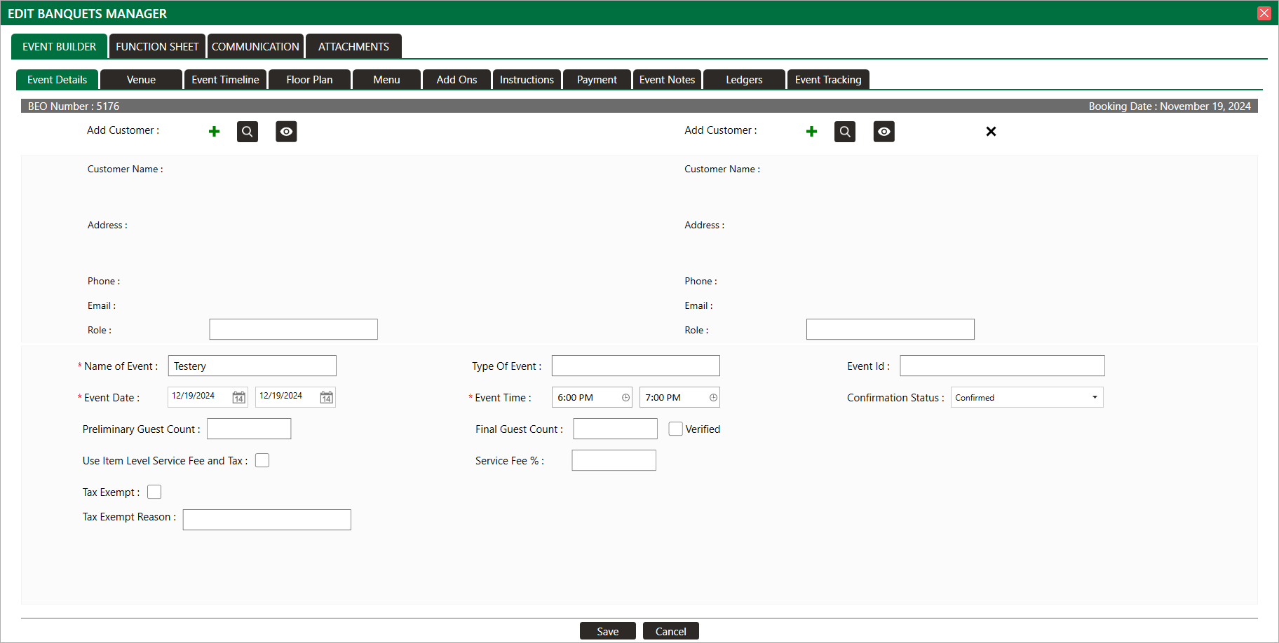 Step 2: Select the event to be closed from the BANQUET MANAGER list of events by double-clicking on the event or clicking the event's ACTION button and selecting View/Edit. This will open an EDIT EVENT window.