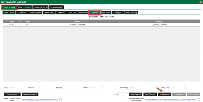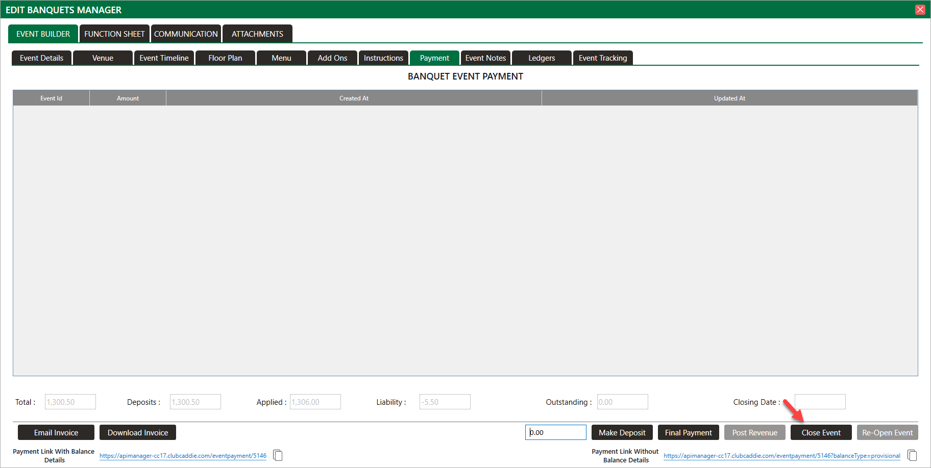 Step 3: Select the Payment tab. Then click on Close Event. A confirmation window will pop up and select Yes to close.