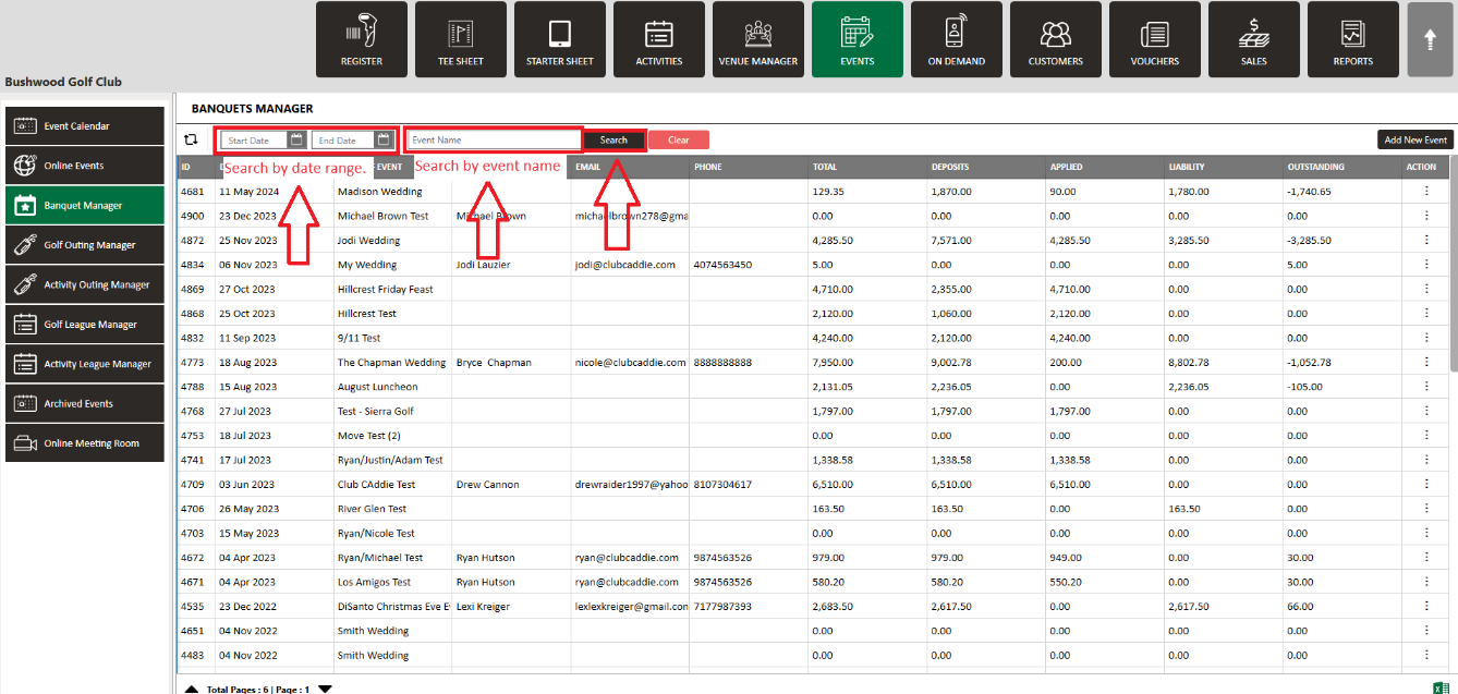 Step 2: The system will show a list of banquet events. Events can be filtered by Day, Date, or Month, then click on the Search button.