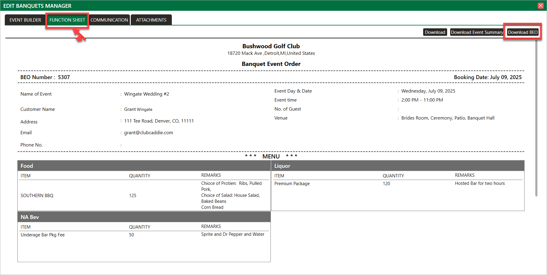 Step 3: Click on the FUNCTION SHEET tab and click on the Download BEO button at the top right of the window.
