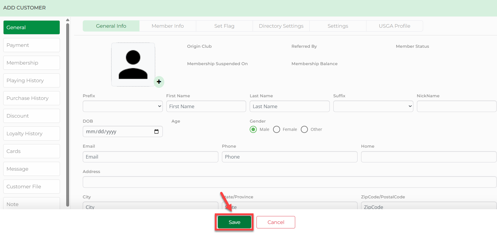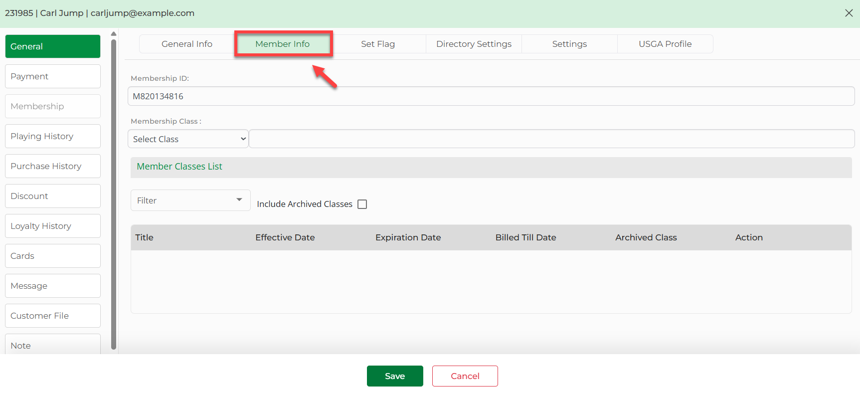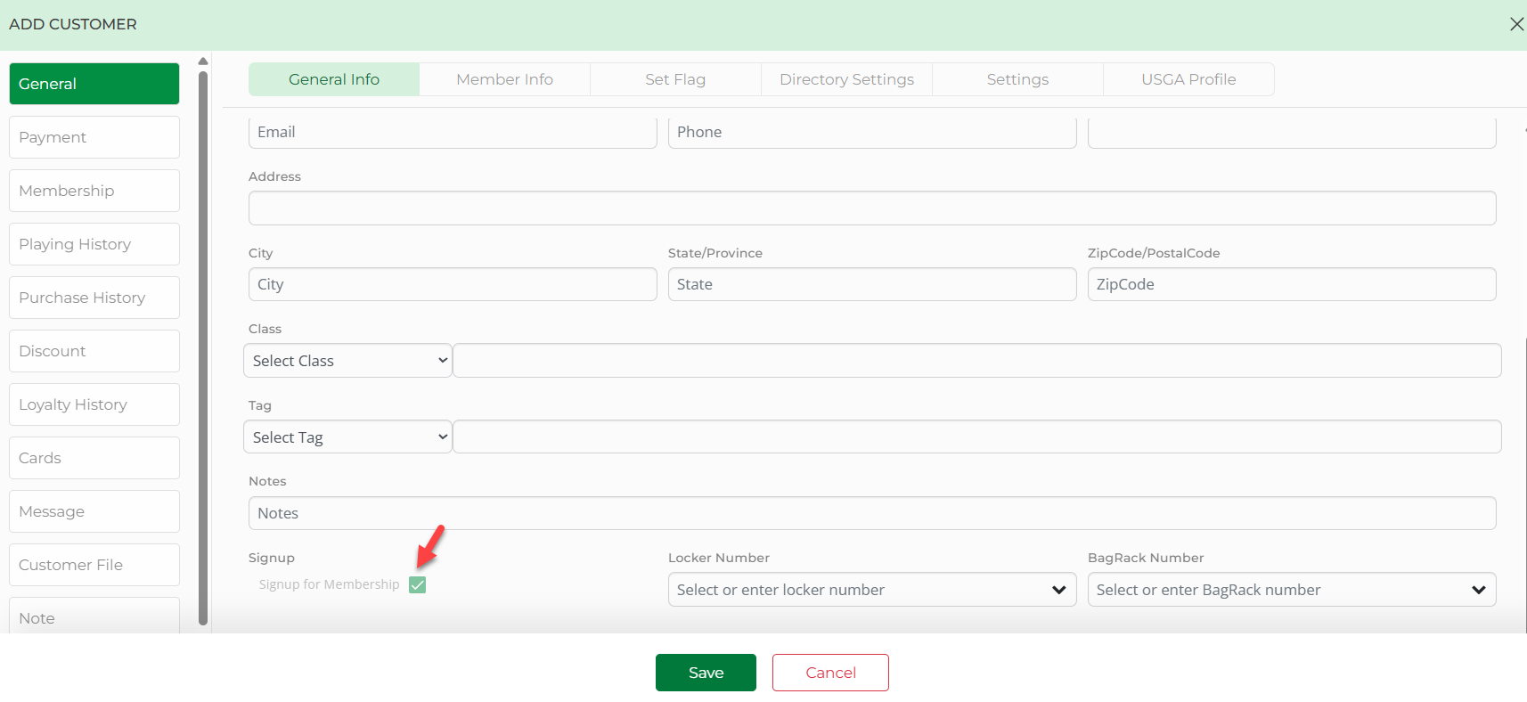 Step 4: After completion of Customer GENERAL INFO you can assign a class to the customer. First check the box Signup for Membership, and then click on MEMBER INFO under the General Tab.