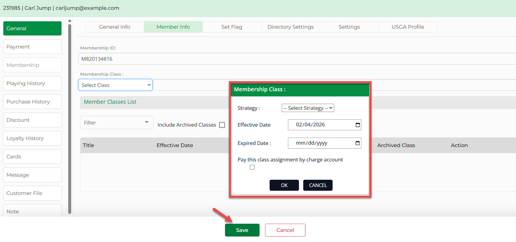 Step 5: Select the membership class from the Membership Class dropdown list then select the Expiration Date and click the Save button.