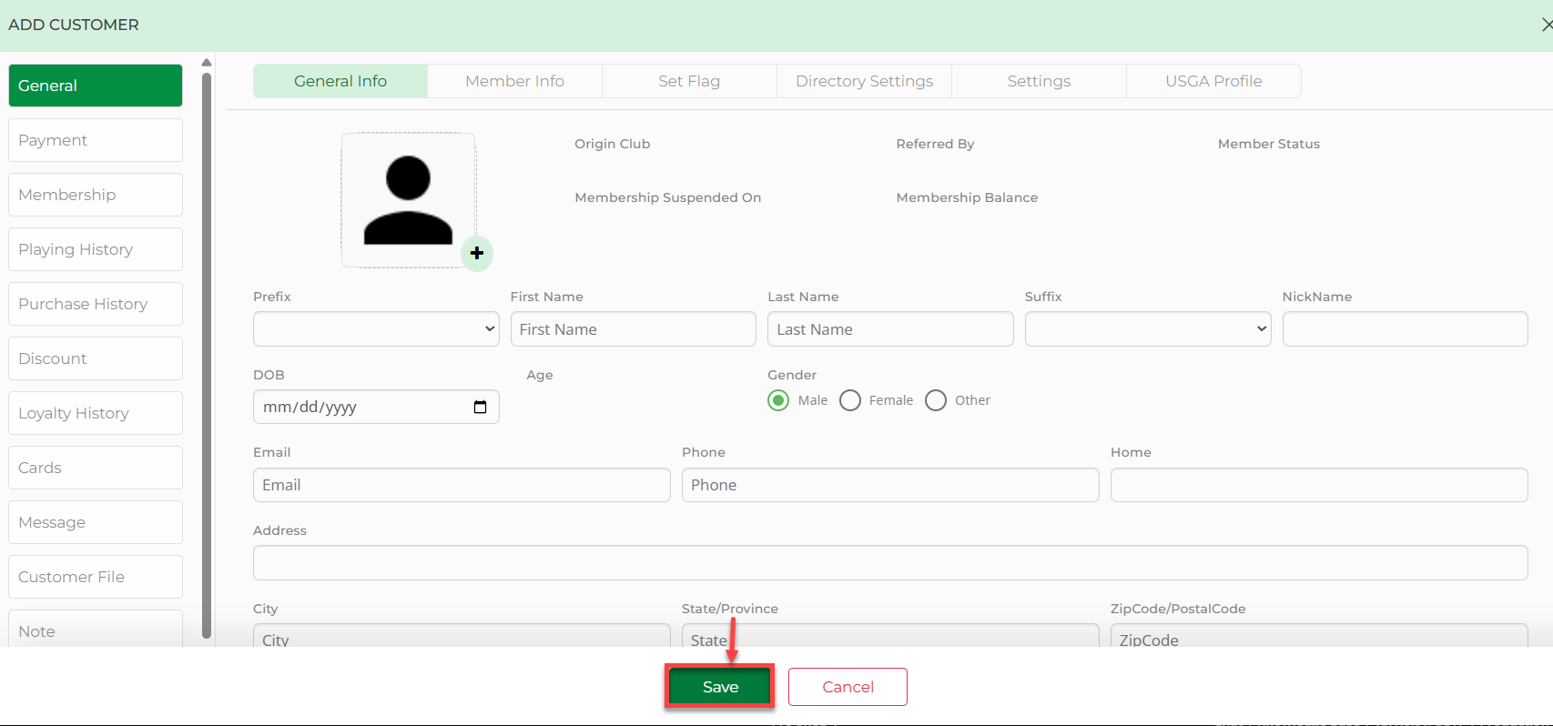 Step 3: For a new customer, select the + symbol. The system will show you a pop-up called Add Customer to fill in customer details. Fill in all customer details, and then select Save.