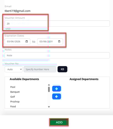 Step 4: Within the Generate Credit Voucher window, fill in the Voucher Amount and Expiration Dates, then the Add button.