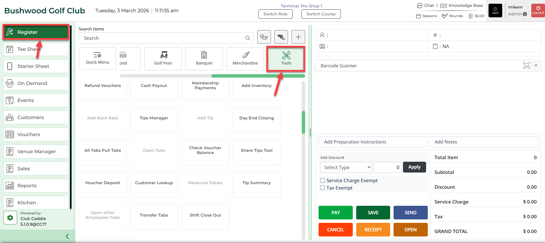 Step 1: Select the Register module from the module navigation menu. Then select the Tools button, followed by Check Voucher Balance.