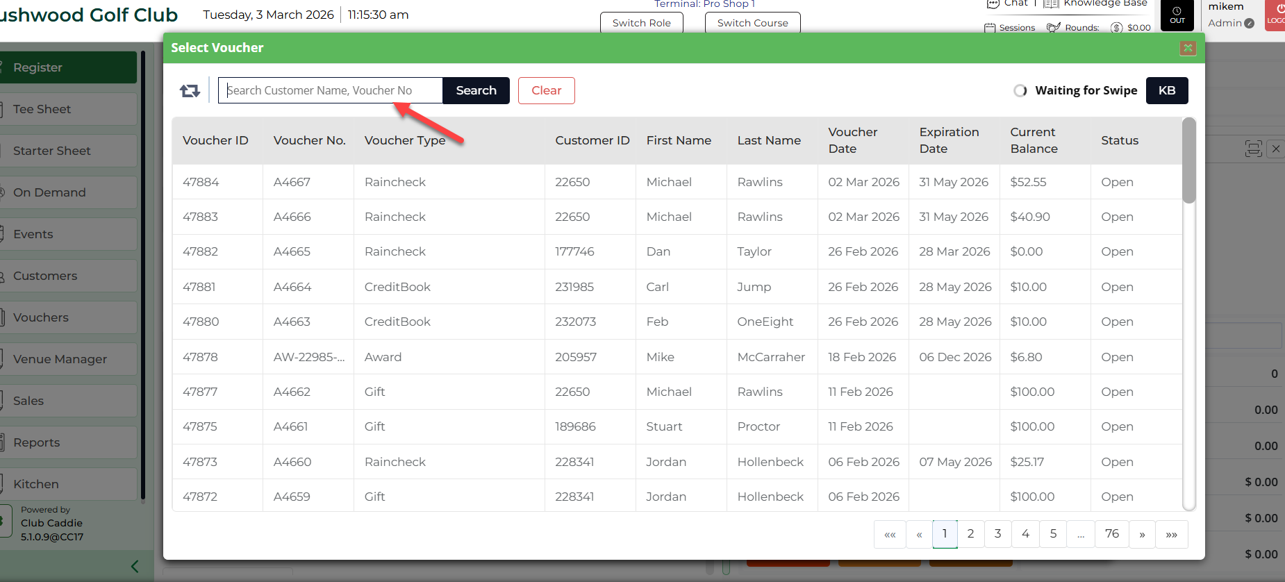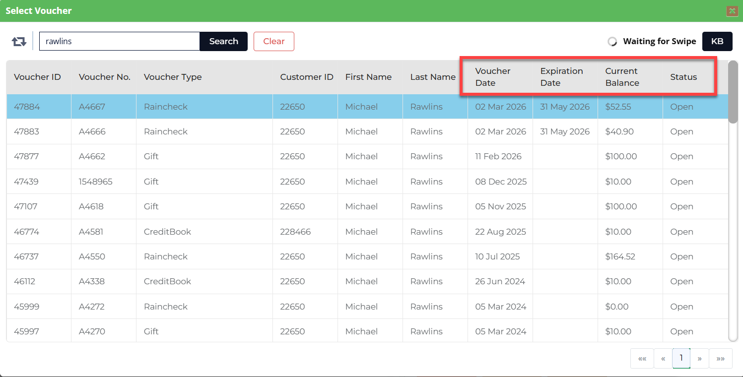 Step 3: Enter in the voucher number and click search. Please keep in mind, you can also search by customer name as well. Upon locating the voucher, you'll see details such as Expiration Date, Current Balance, and Status.