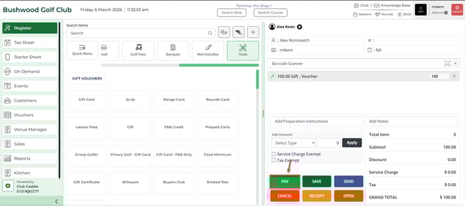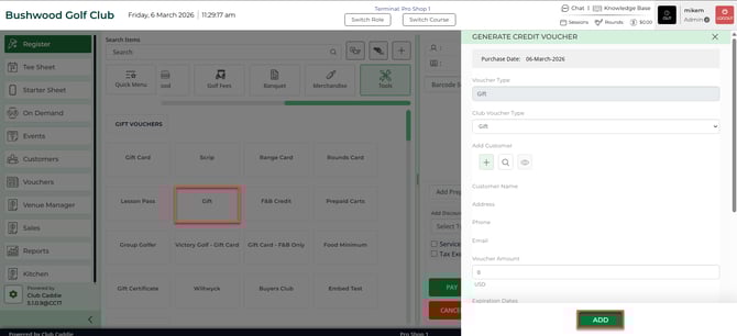 Article Contents: This article contains step-by-step instructions on how to create and sell a Gift Voucher in Club Caddie using the Register.