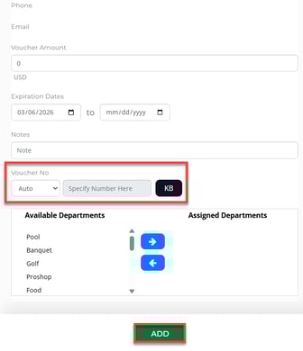 The voucher number can be auto-generated by selecting Auto from the drop-down menu, or you can also create a unique voucher code by selecting Specified from the drop-down. Select the ADD button to complete.