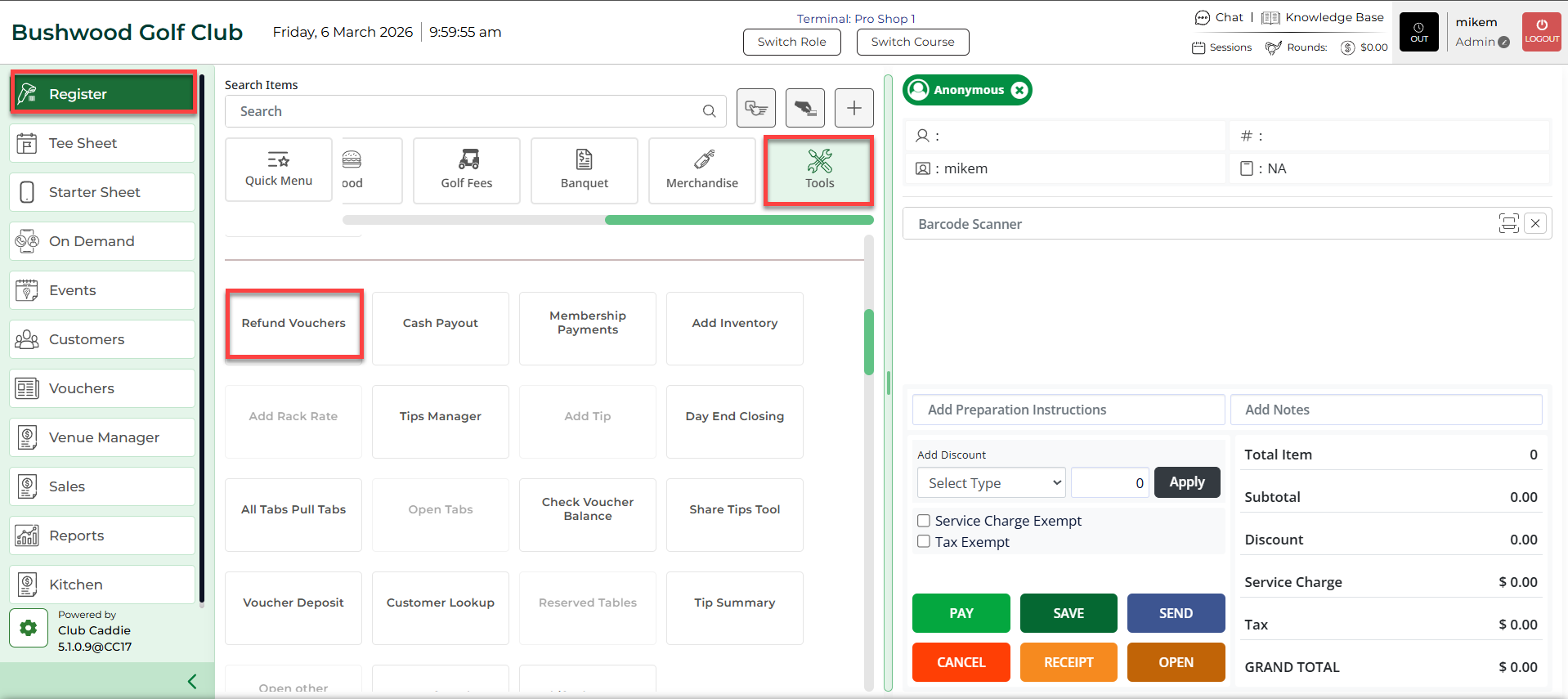 Step 1: Select the REGISTER module, select the TOOLS, then Refund Vouchers.