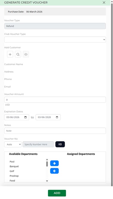Step 2: The system will open a GENERATE CREDIT VOUCHER window to fill in Refund Voucher details. Fill in details like Name of Recipient, Voucher Amount, Expiration Date of the voucher, and Notes. The Voucher Number can be auto-generated by selecting Auto from the Voucher No. drop-down, or you can also create a unique voucher code by selecting specified from the drop-down. Click on ADD after filling out the credit voucher details.