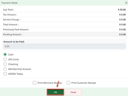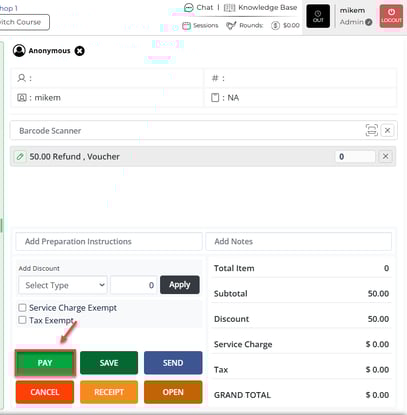 Step 3: The system will create a Refund Voucher in a new register tab. A payable amount will not be listed on the tab because the system will be issuing the customer a credit. Select Pay and select cash from the PAYMENT MODE window and press Ok.