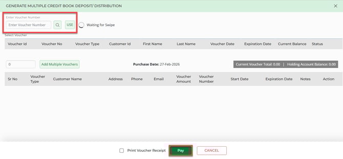 B) Under the voucher number column you can specify a custom voucher number or alternatively swipe a hard gift card number.