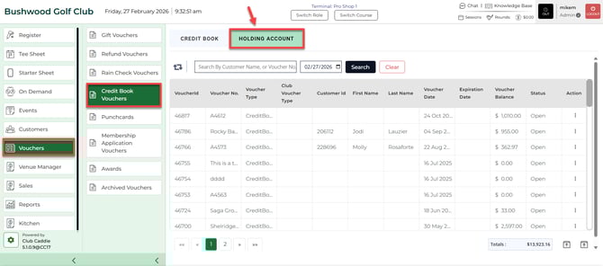 Step 3: To check the balance, usage history, or make additional edits to our newly created holding account we can navigate to the Voucher module found in the top navigation bar. Next, select Credit Book Vouchers, then Holding Account.