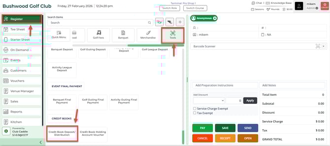 Step 1: Navigate to the register module and select the Tools section. Under the section Credit books you'll find the Credit Book Deposit option.