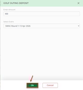 Step 3: Once the event for the deposit is chosen, the system will create a DEPOSIT pop-up. Fill in the details of the amount of the deposit and select the pre-registered event from the Select Event drop down. Then click Ok.