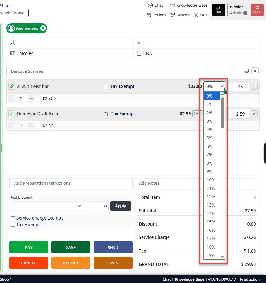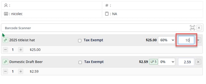 Step 3: To apply a discount to that item, enter a percentage in the discount % field on that row. The price will update automatically to reflect the discount.