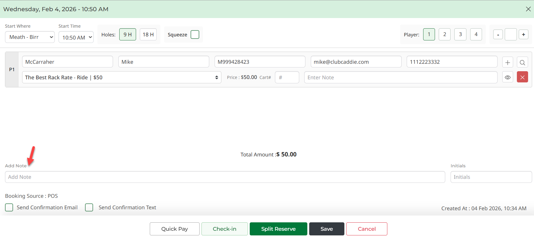 Step 3: Within the tee booking window pop-up, you can enter an individual notes for the tee booking in the Add Note text box. Click Save.