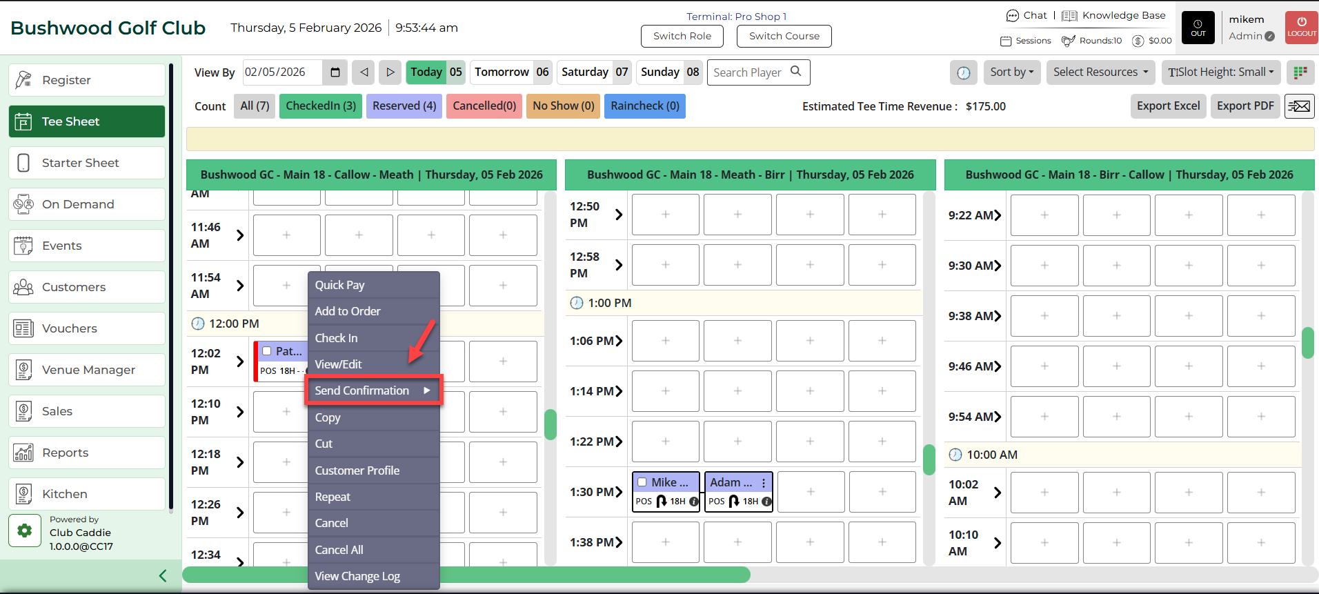 If you need to resend the confirmation, this can be done by right clicking on the reservation, Send Confirmation, and then select Email, Text, or Both.