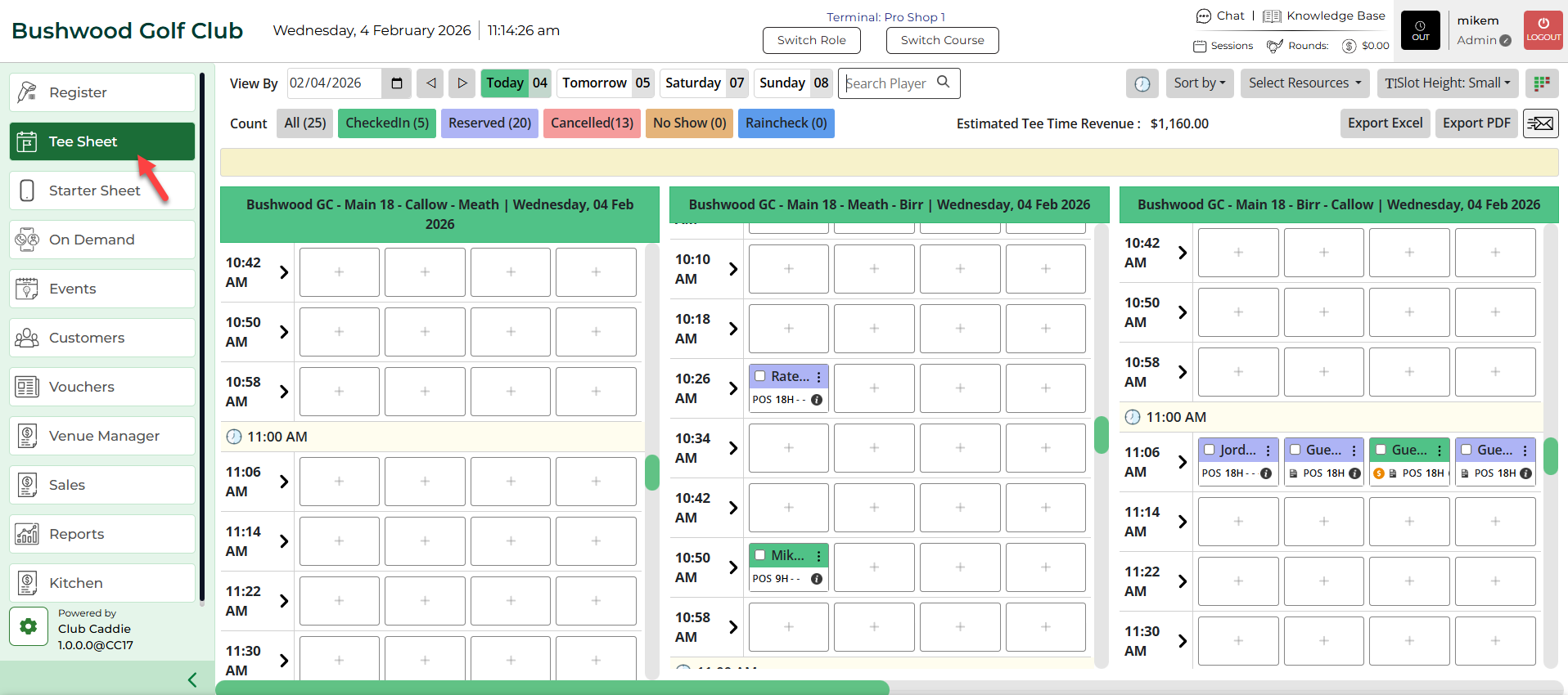 Step 2: Go to the Tee Sheet and select a time slot. Right-clicking on the Tee Sheet slot will open a pop-up window containing the option of Checkin. Click on it to check-in.