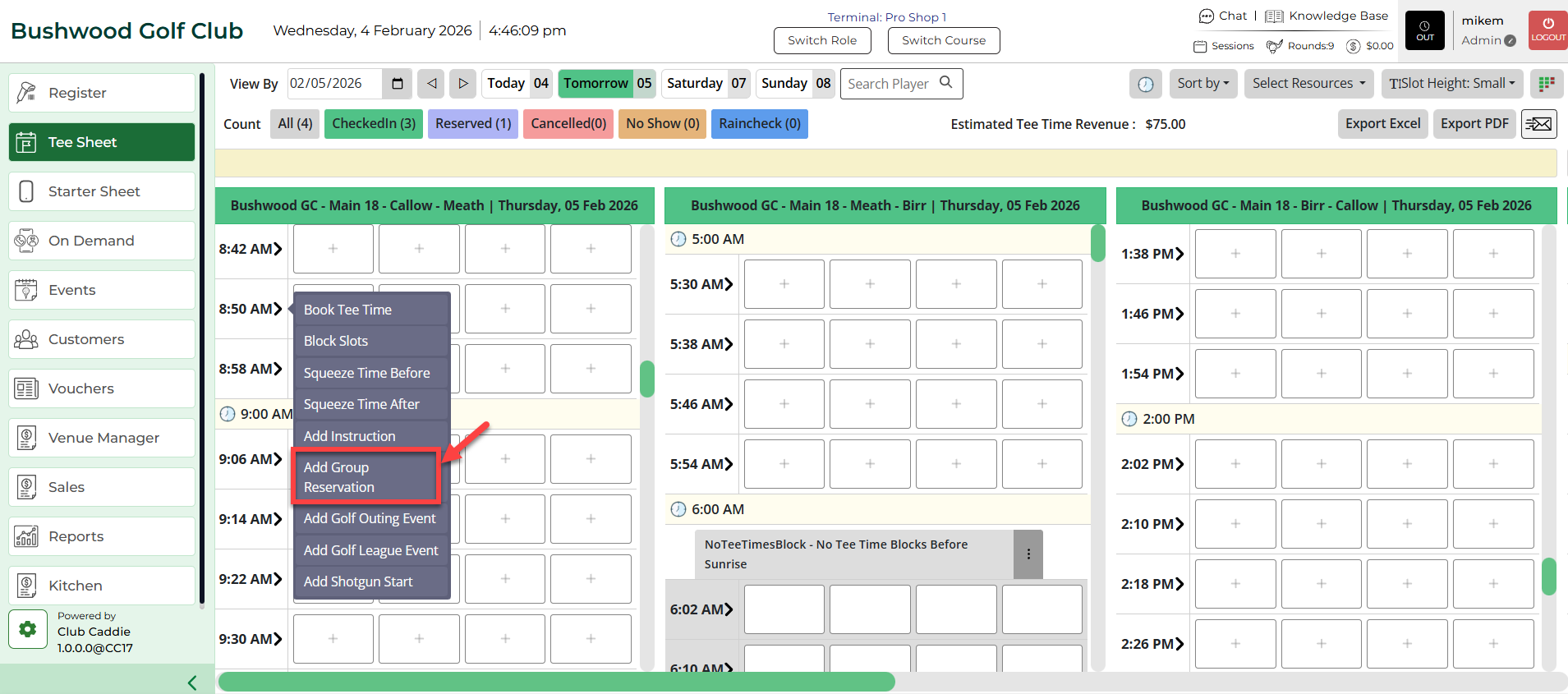 Step 2: Right click on the start time and click on Add Group Reservation.