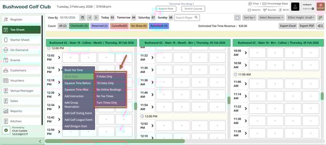 4) No Tee Times Block - will prevent tee time bookings from being made online as well as being made through the point of sale by any course users.