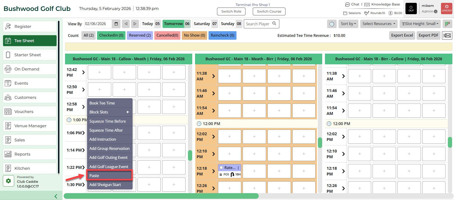 Step 3: Then, paste it by right clicking on the tee time you wish to book and select Paste. You can see the same booking will be present there.