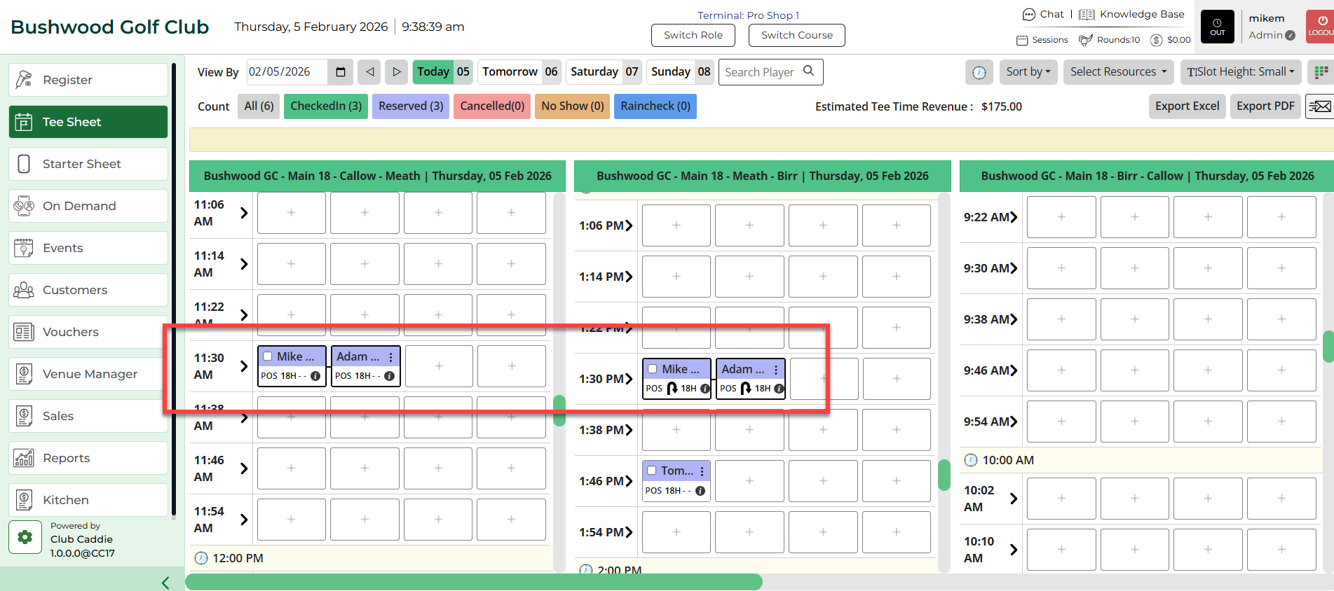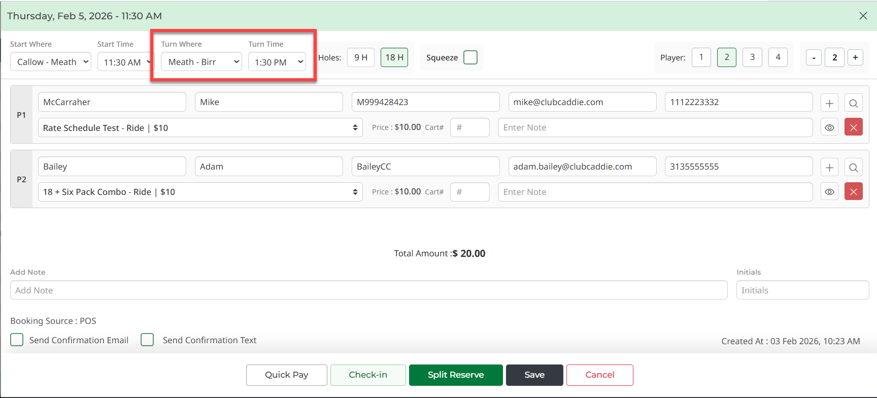 Step 4: Click Reserve/Save. A tee time and turn time will be reserved.