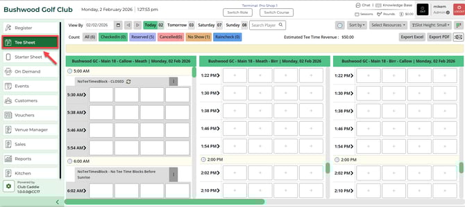 Step 1: Click on the TEE SHEET module from the left hand side menu.