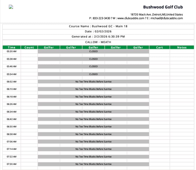B) Click on the Export Pdf button. A tee sheet pdf like the one below will be produced.