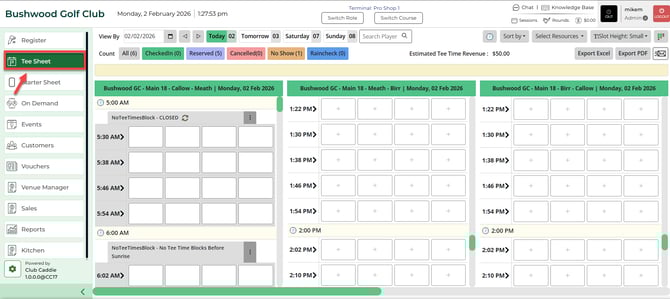 Cancelled: Displays all of the tee-time bookings that have currently been canceled for the day.