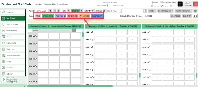 Step 2: In the top right-hand portion of the TEE SHEET module you have a number of colored options that when clicked will filter your day's Tee-Sheet to the desired status.