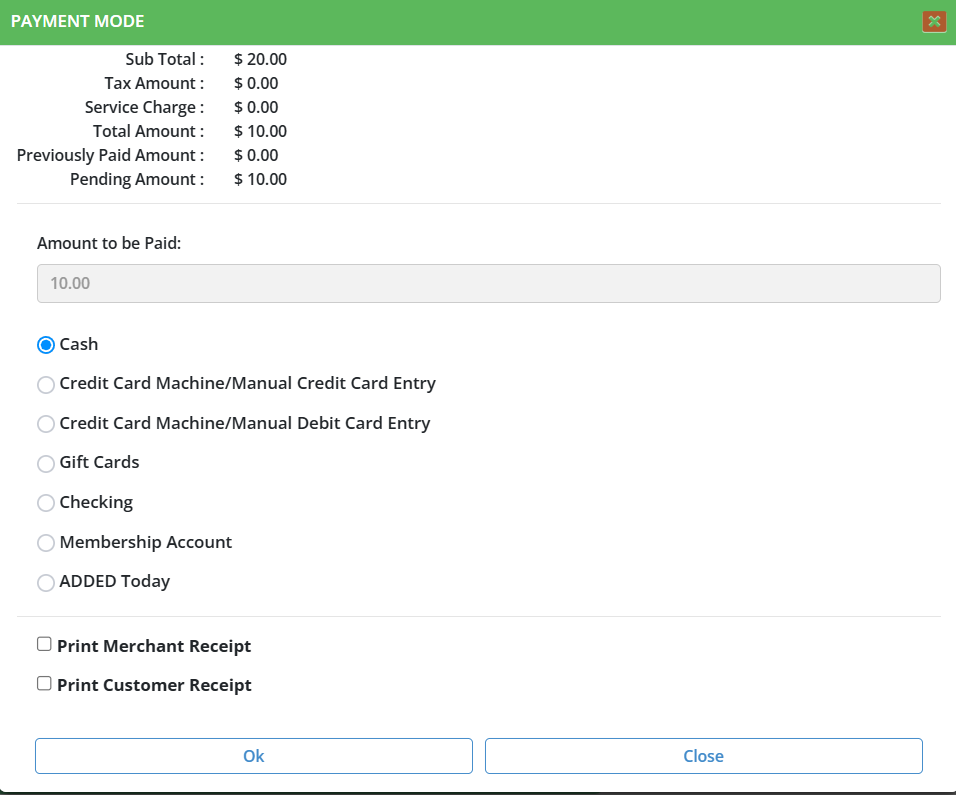 Step 3: The system will generate a new PAYMENT MODE window. Select the payment type then click on the Ok button.