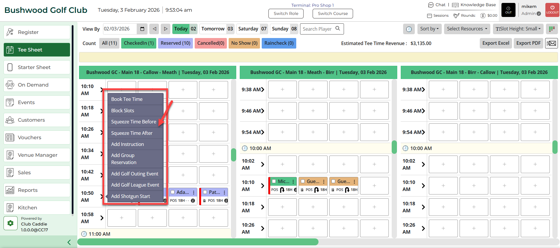 Step 2: Navigate to the Tee Sheet module. Then click on the time where you would like to add the Squeeze Time.