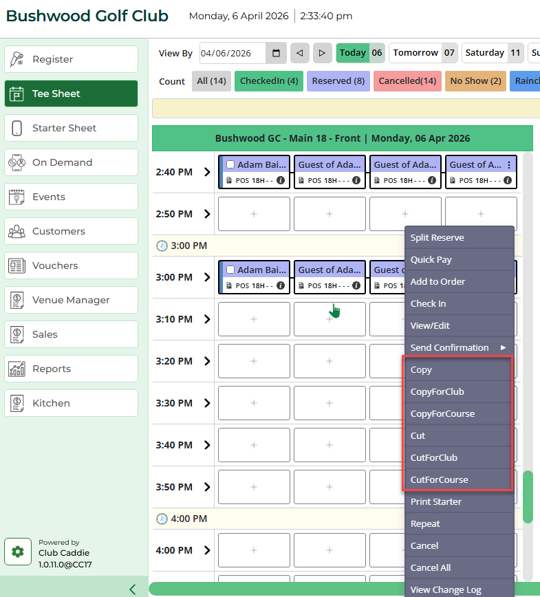 - Cut/Paste — reschedule a tee time. The booking is removed from the original date and placed on the new one.