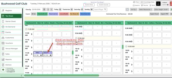 - Click and hold the tee time, then drag it to the new time slot.