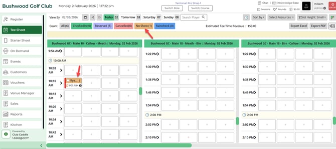 To filter the tee sheet for no-shows, select the "No Show" option located in the "Sort By" section at the top right of the tee sheet. The "No Show" label will display the count of no-shows for the selected date, if applicable.