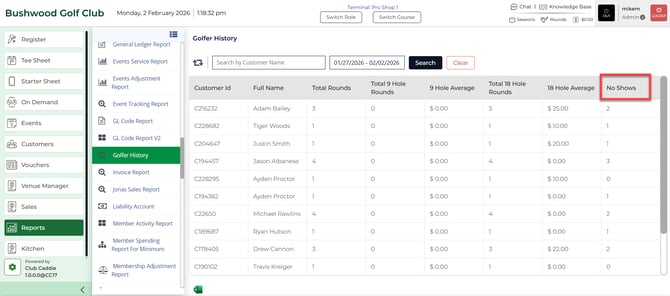 Access the Golfer History report to view each golfer's no-show occurrences, with the ability to filter by date.