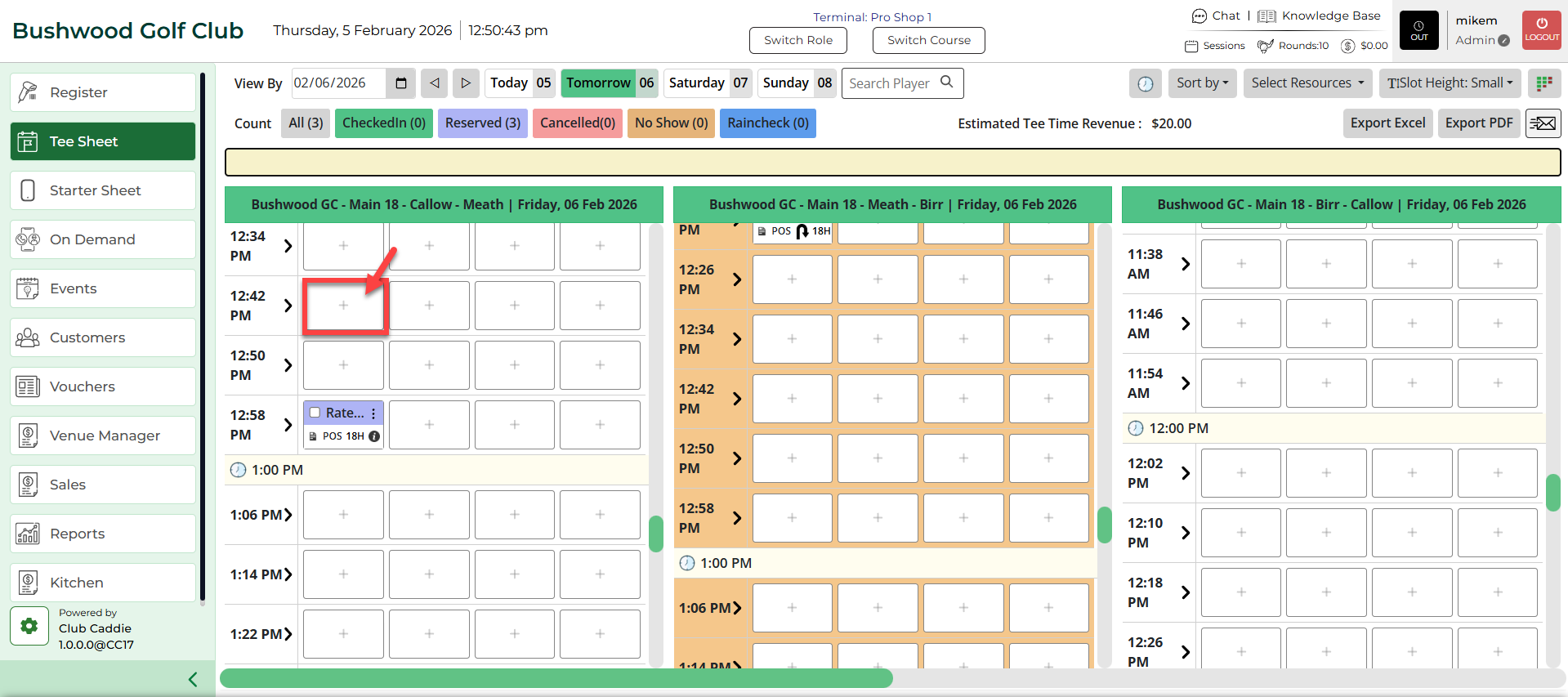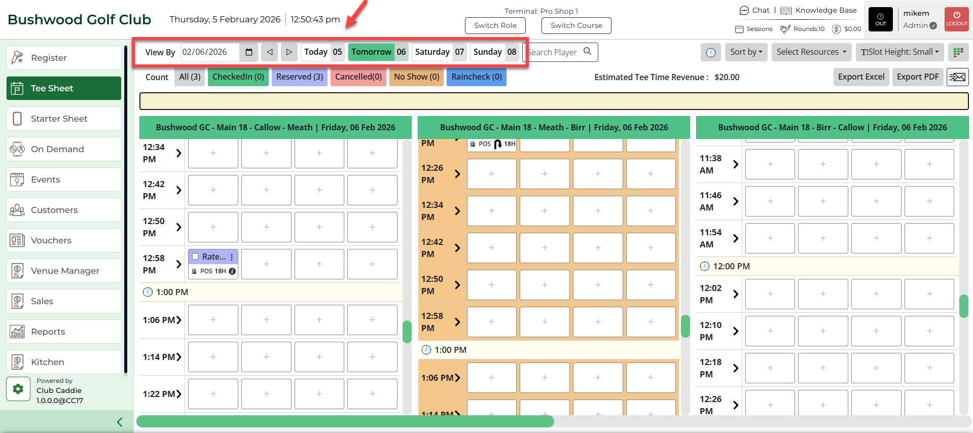 Step 2: The default date selection will be today's date. If you wish to book for a future date, choose a date from the date selection in the top left-hand corner of the tee-sheet module. For quick navigation you can utilize Today button to return to today.