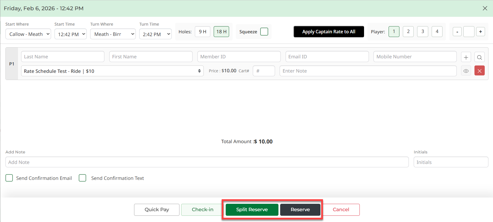 - To finalize your reservation after the applicable fields have been filled out, click on the “Reserve” "Split Reserve" button.
