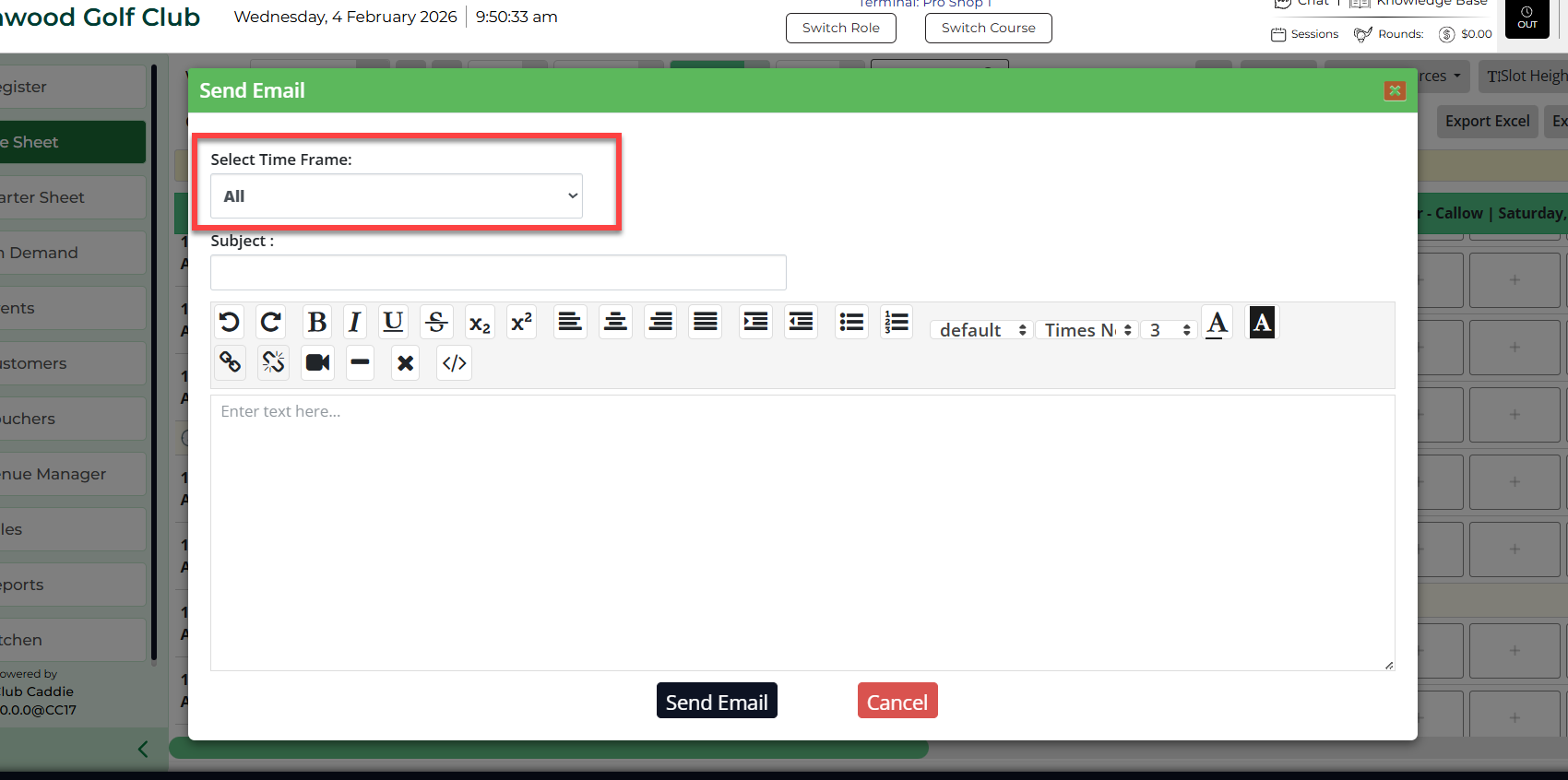 Browser - Tee Sheet: Send Email