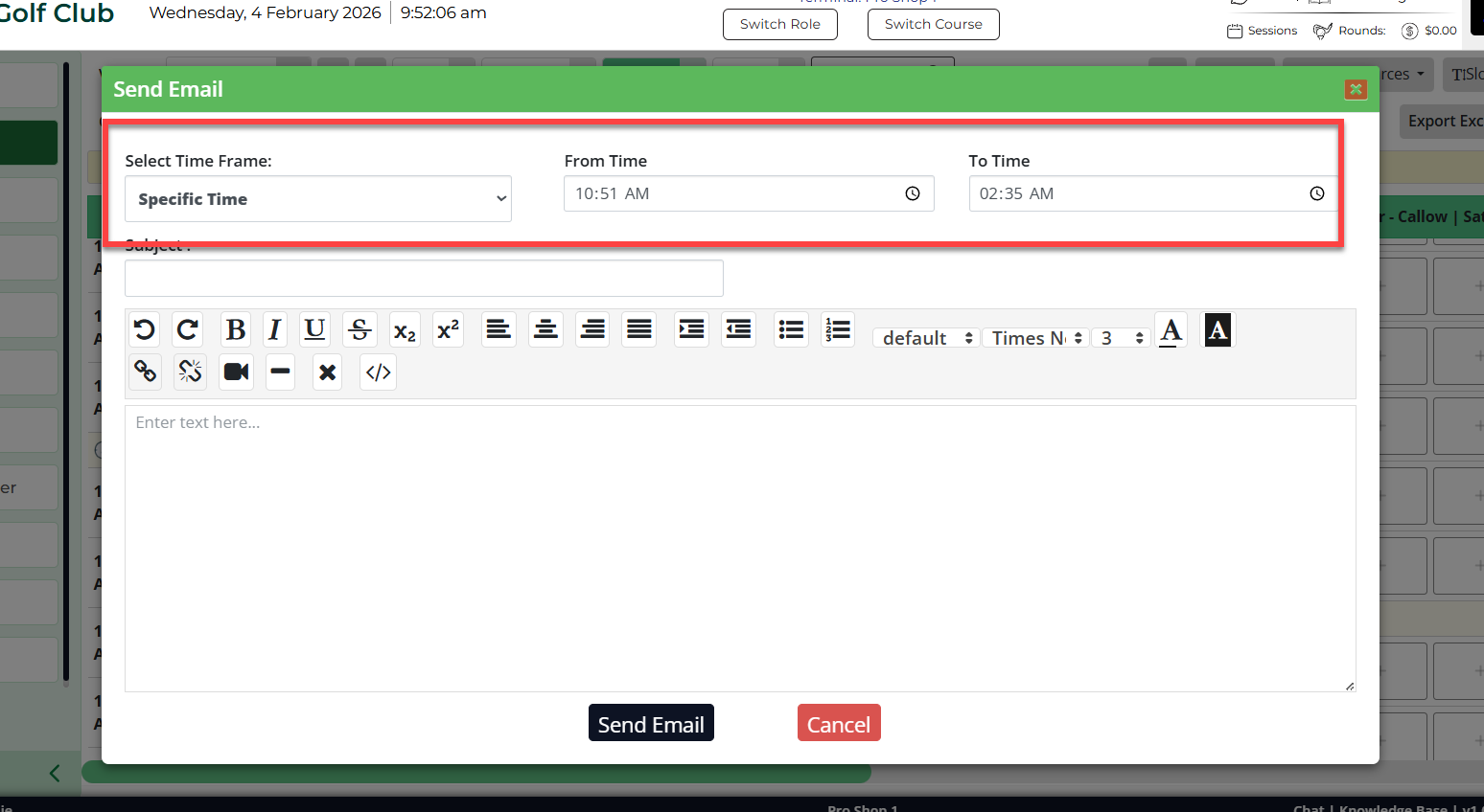 Step 4: If you want to send an email to specific time span on a tee sheet for a day, select the Specific Time option in the e-mail window. Then enter the time span, subject, and the information you want to inform. Finally, click Send E-Mail.