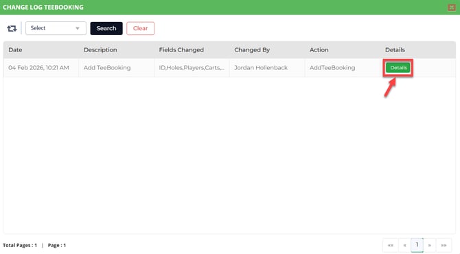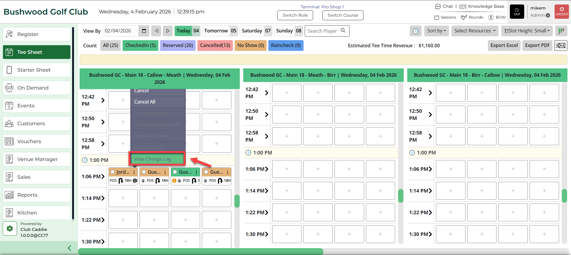 Step 3: Click View ChangeLog to open the change history for the selected tee time.