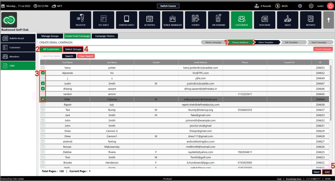 Step 3: Once you complete the above step, the next window will be Choose audience (1) and the system will have generated a list of All Customers (2). You can click the Tick Boxes (3) to select the players you want to add to this email campaign. You can also choose from created groups by clicking on the Select Groups tab (4) after clicking the Tick Boxes to select groups of players you want to add to this campaign. Once you have selected players or/and groups, click on the Add button at the bottom right corner (5).![]()