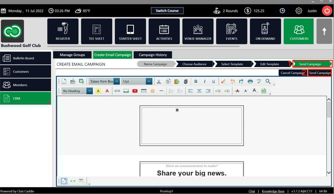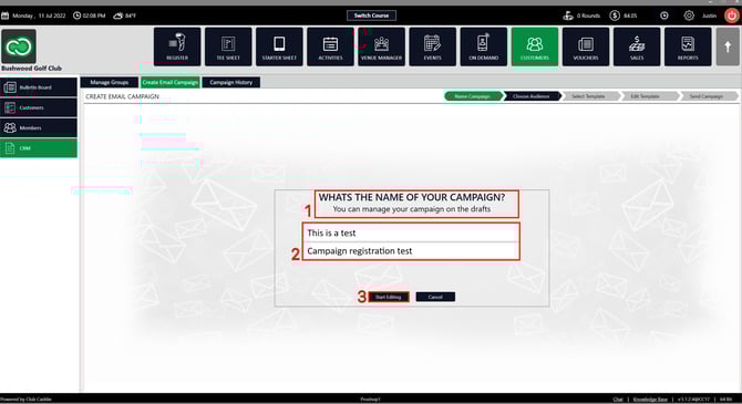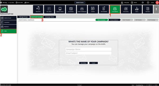 Step 1: Click on the Customer tab (1) from the header of the window. Select CRM (2) from the left row of the window, then select Create Email Campaign tab (3).