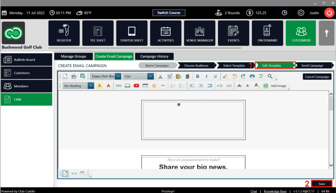 Step 5: Once you select the template from the above steps, you will be taken to next window Edit Template (1). You can fill in the content of the email campaign using the available tools, ie. font, adding hyperlinks, etc., just like you can edit content in MS Word. Once you have filled in your email marketing material, click on the Save button (2) at the bottom right side of the screen.